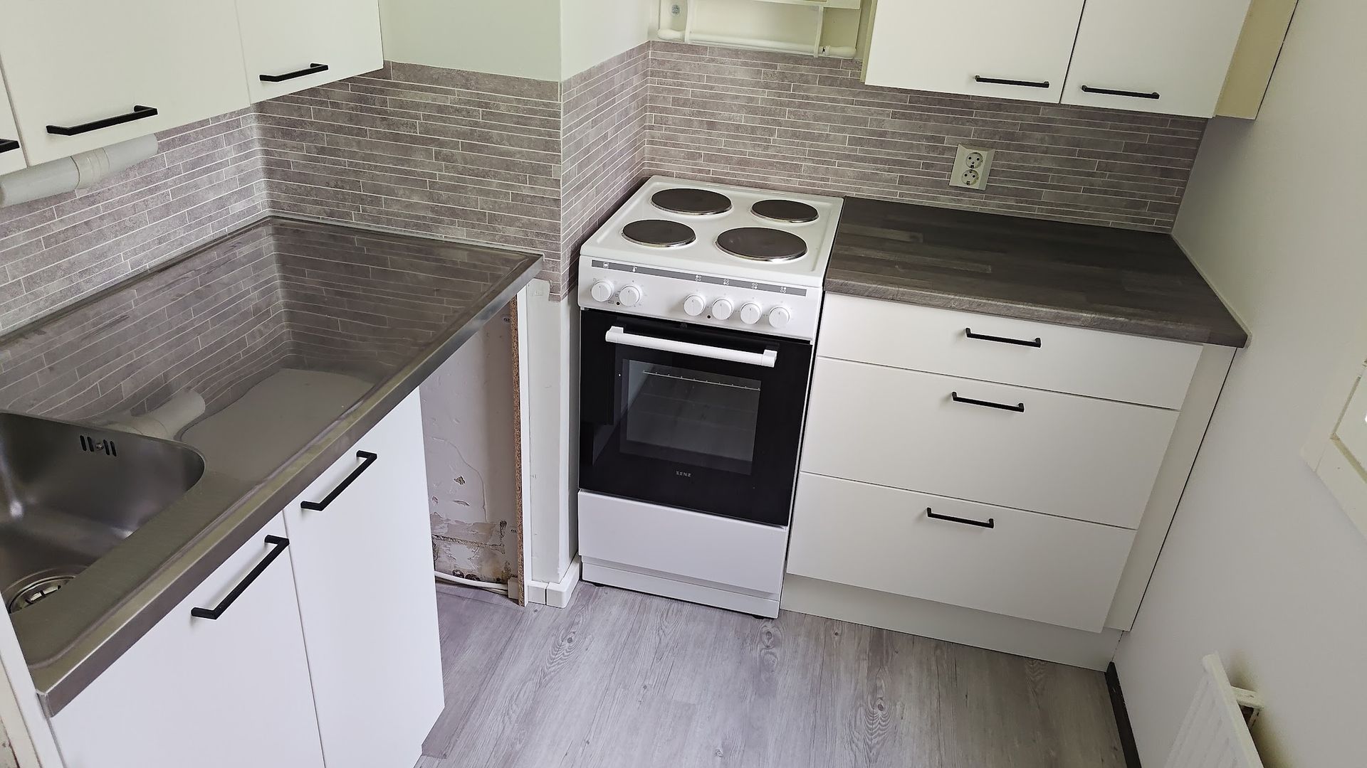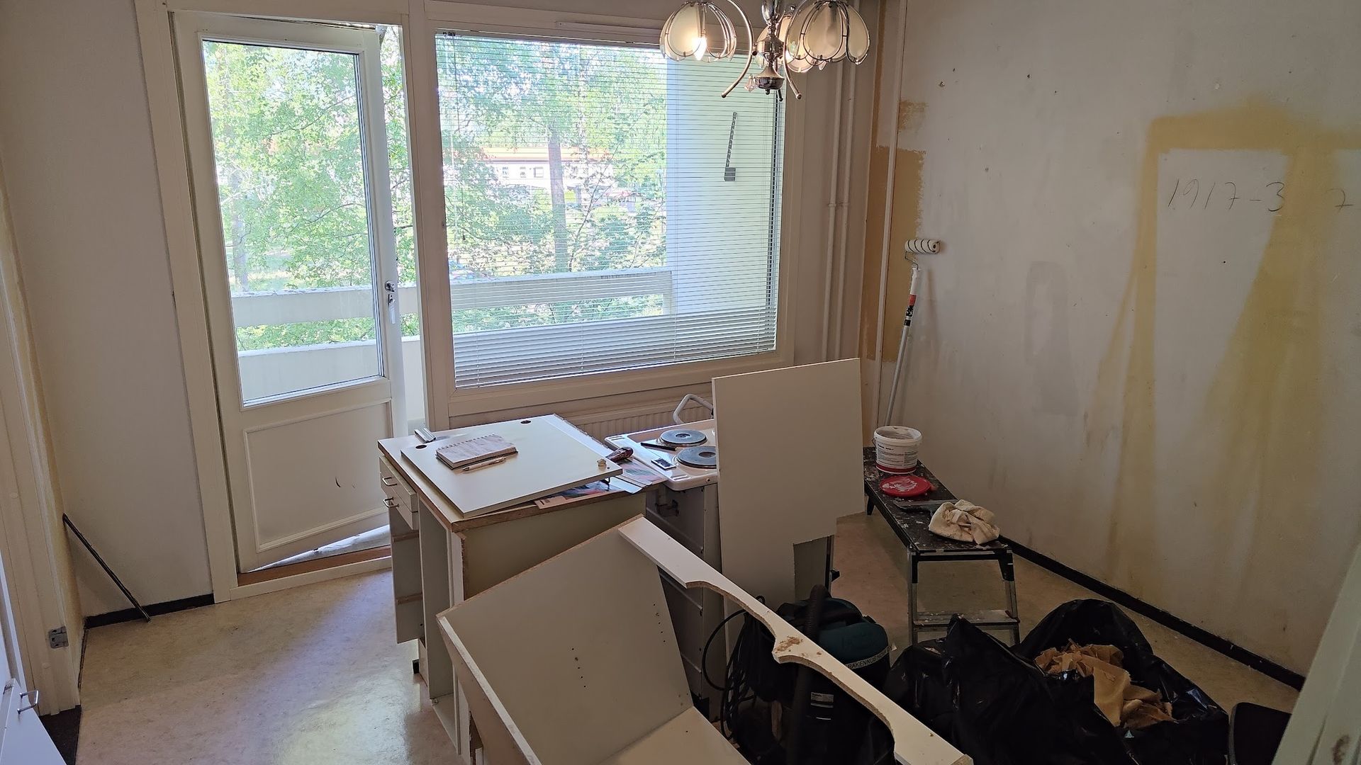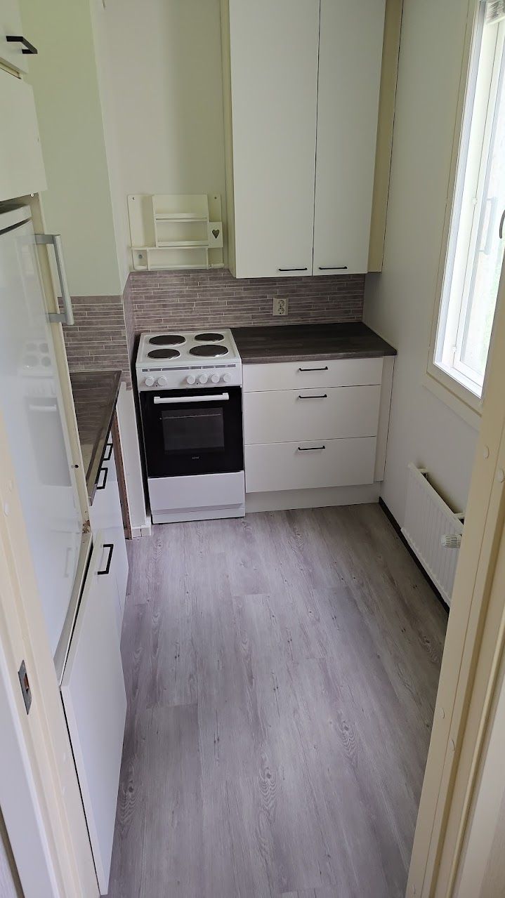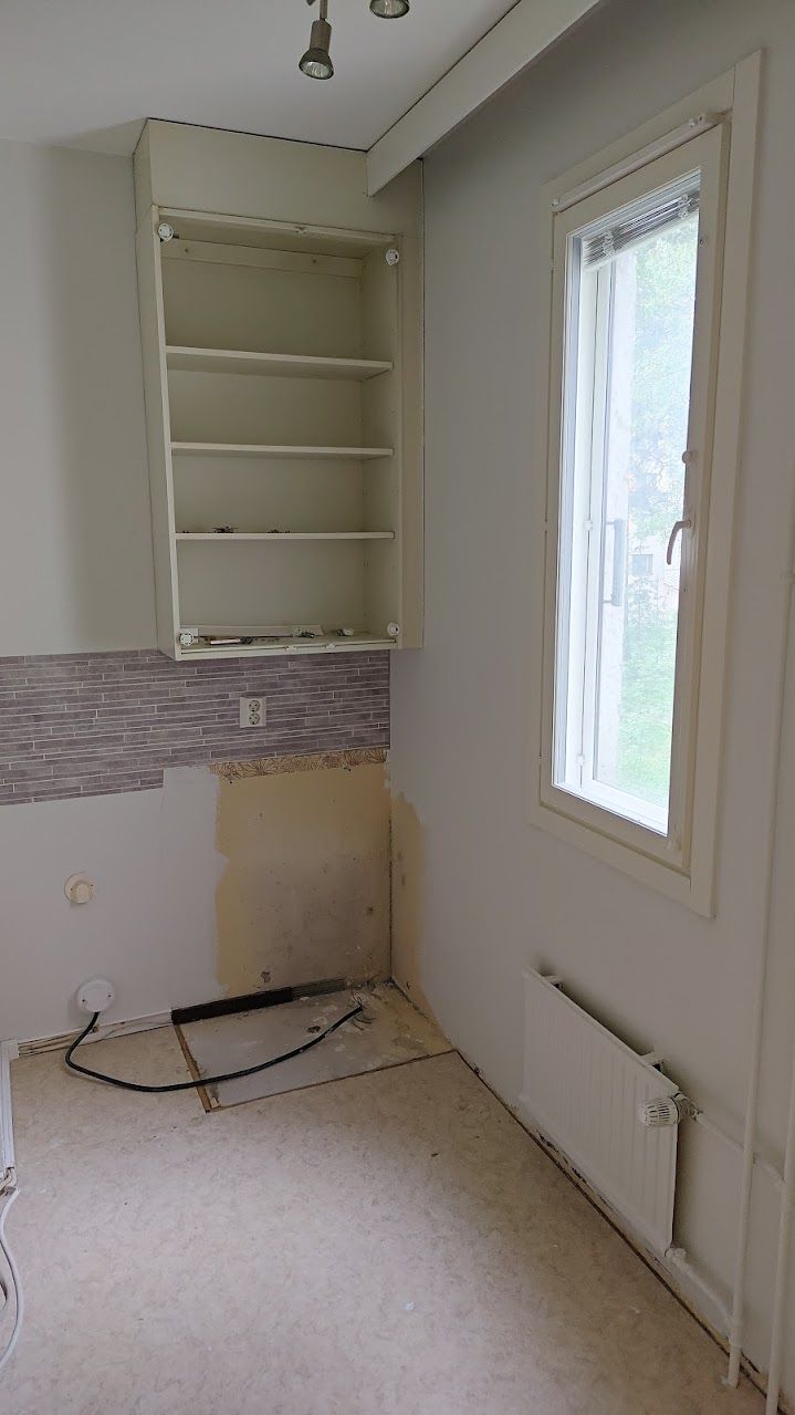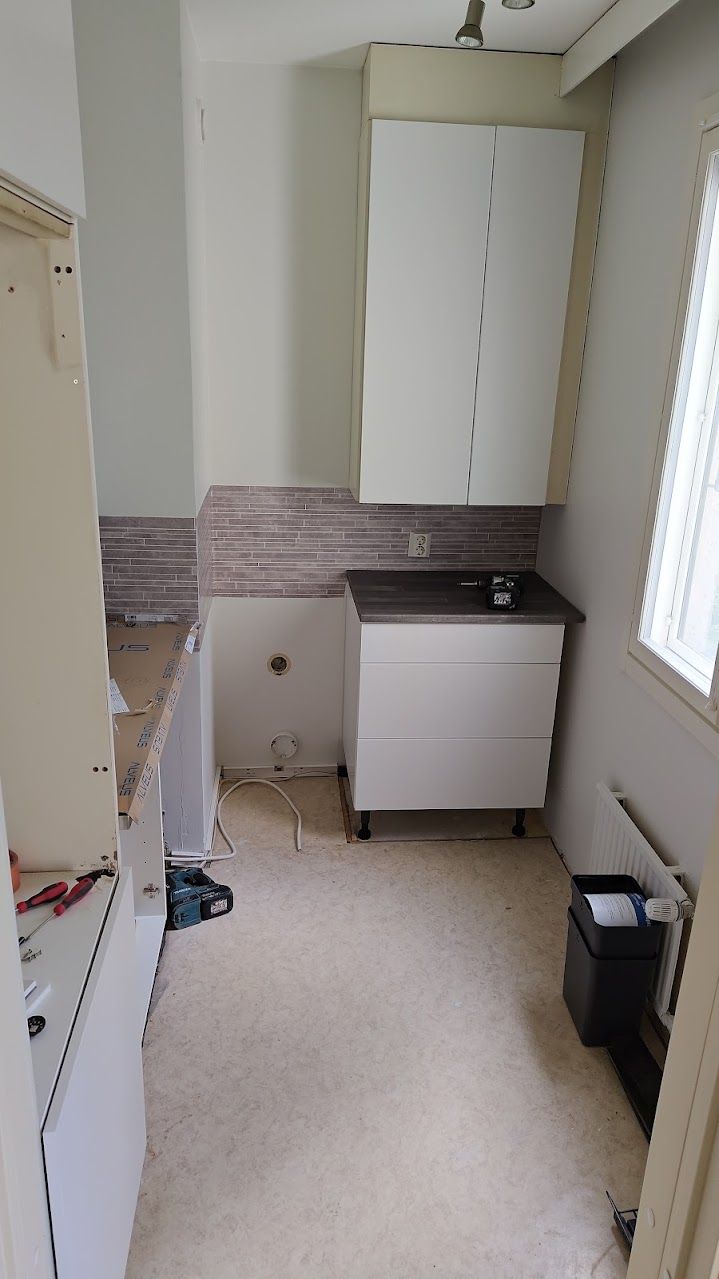 Uusittiin asunnon pintoja, keittiöön kalusteita, kodinkoneita ja astianpesukonepaikka