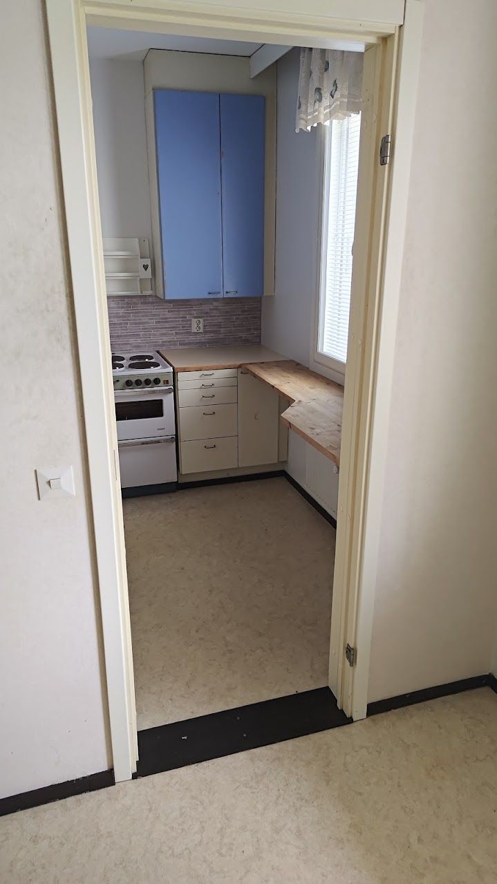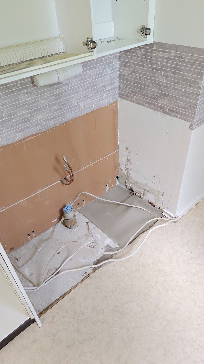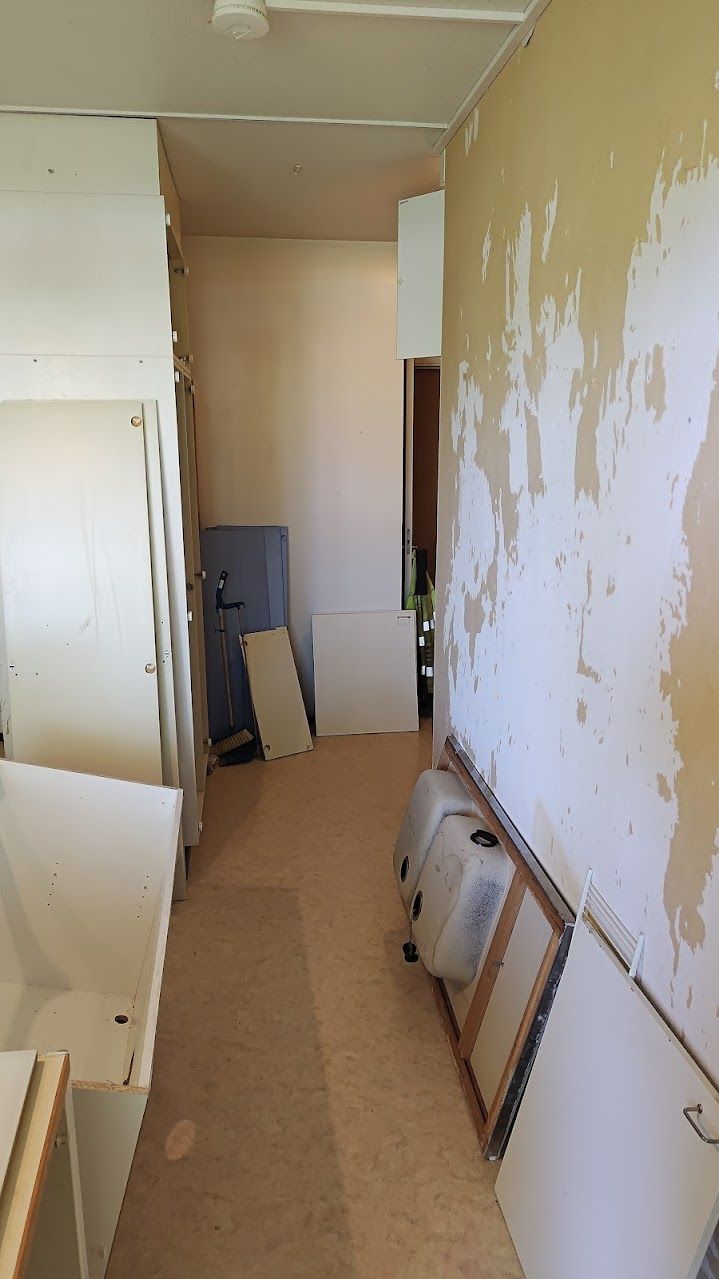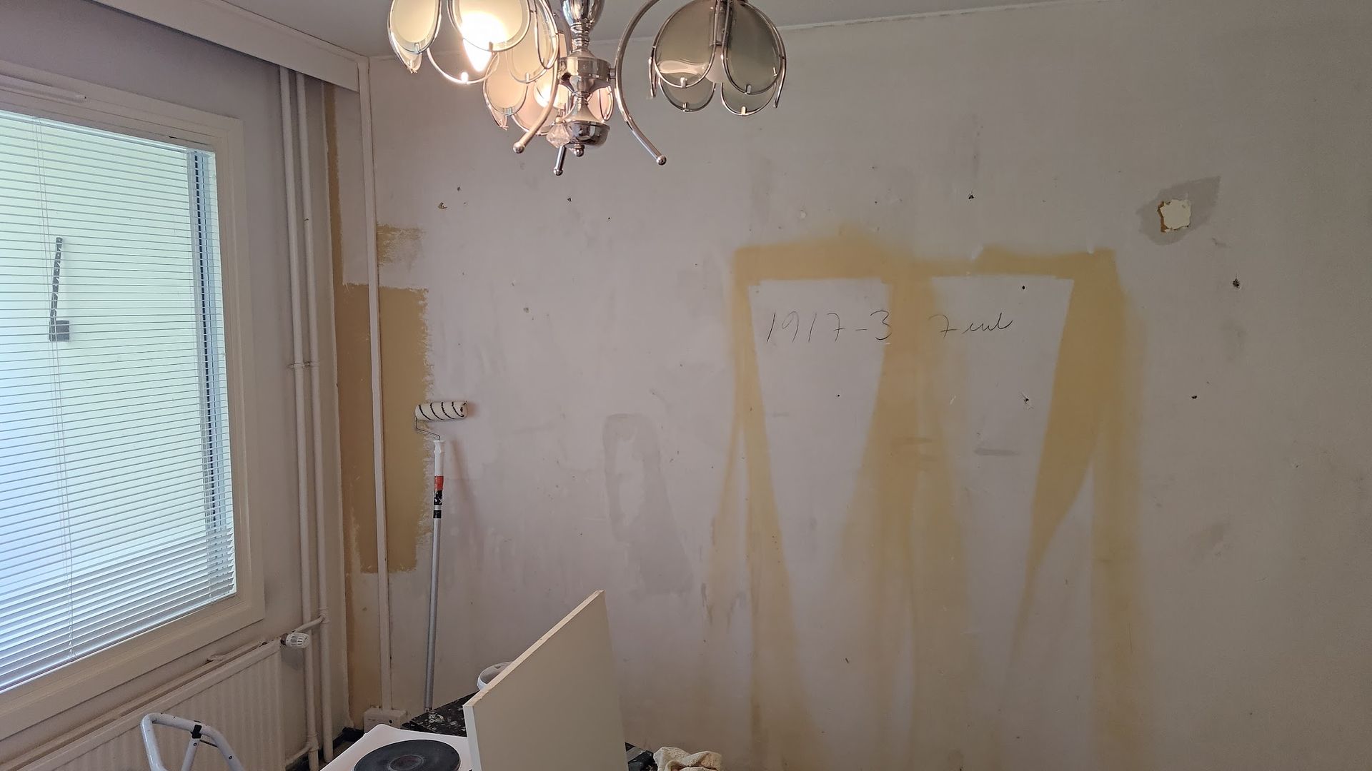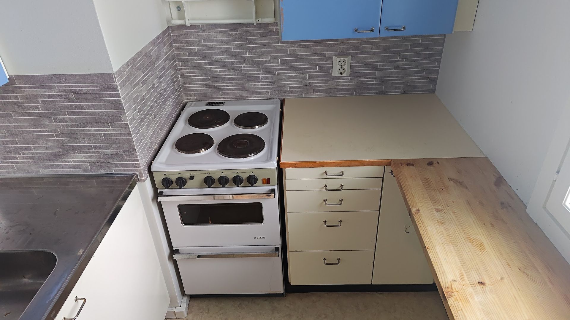Uusittiin asunnon pintoja, keittiöön kalusteita, kodinkoneita ja astianpesukonepaikka
